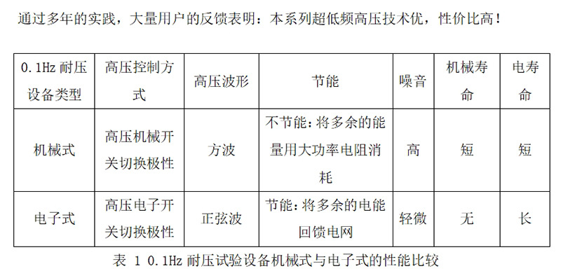 我公司新一代系列超低頻高壓發(fā)生器是采用自主研發(fā)的核心產(chǎn)品,采用 7 寸觸模屏、進(jìn)口高速AD采集電路,以及新生產(chǎn)工藝。提高了儀器質(zhì)量穩(wěn)定性,降低了設(shè)備的體積和重量,操作簡單,克服了國內(nèi)同類產(chǎn)品的諸多缺點(見表 1),性價比高于同類進(jìn)口產(chǎn)品的機械式升壓器使用壽命短、故障率高、體積大的缺點。相較于其他幾種耐壓試驗設(shè)備方式而言,0.1Hz超低頻具有諸多優(yōu)點,如表2。