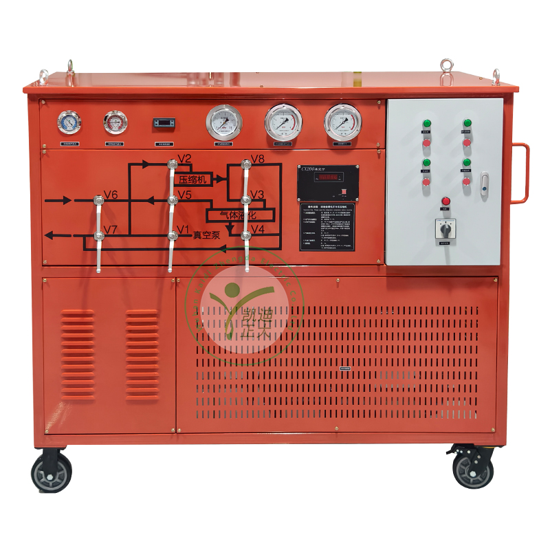 本裝置由SF6氣體回收凈化裝置組成。涉及的產(chǎn)品的主要優(yōu)點為能直接將回收的SF6氣體以液態(tài)的形式貯存入容器,并能將GIS內(nèi)的殘壓回收至53Kpa,擁有較小的體積,便于移動的放置,擁有較快的抽真空速度,能對回收的SF6氣體進行干燥和過濾,還能回充SF6氣體至SF6電氣設備。