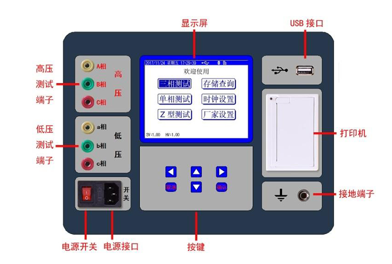 三相變比測試:用于常規三相變壓器變比與組別測量。
